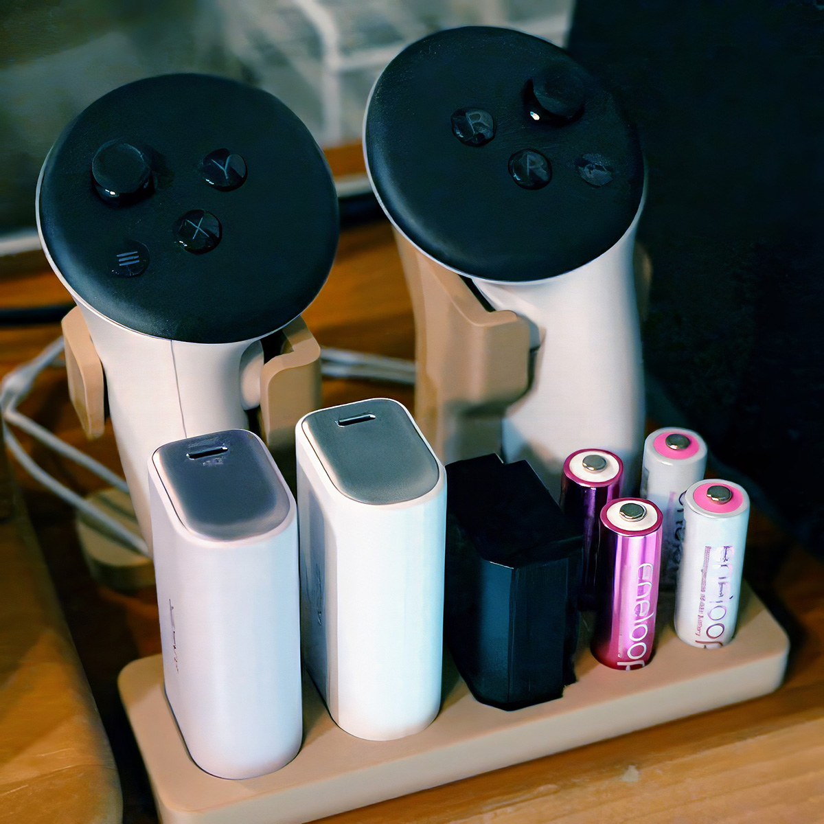 単三 eneloop、ソニーのカメラバッテリー(NP-FZ100)、Anker 621 Power Bank、Meta Quest 3 コントローラを立てるスタンド
