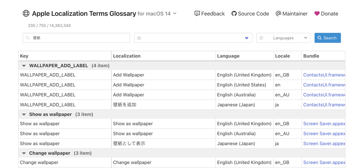 その用途では岸川氏の提供するApple Localization Terms Glossaryという Web アプリケーションも便利なので紹介したい。これは OS 内のフレームワークで実際に使われている文字列を検索し各言語の対訳のセットで表示できるもので OS バージョンを遡って確認することも可能だ。