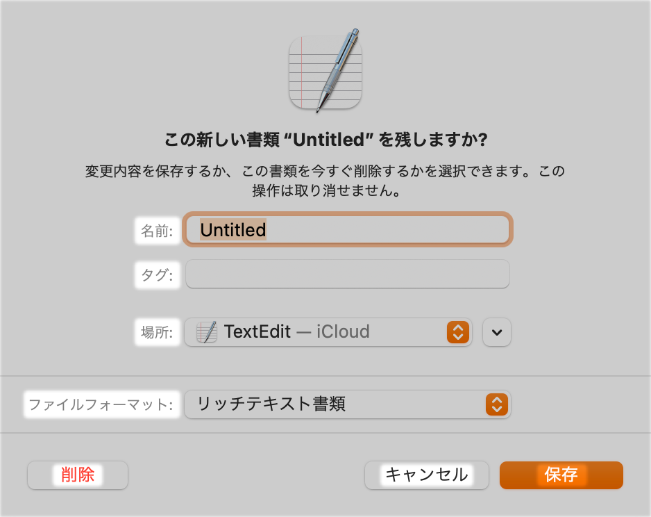 | 項目名 | この新しい書類“名称未設定”を残しますか? | |